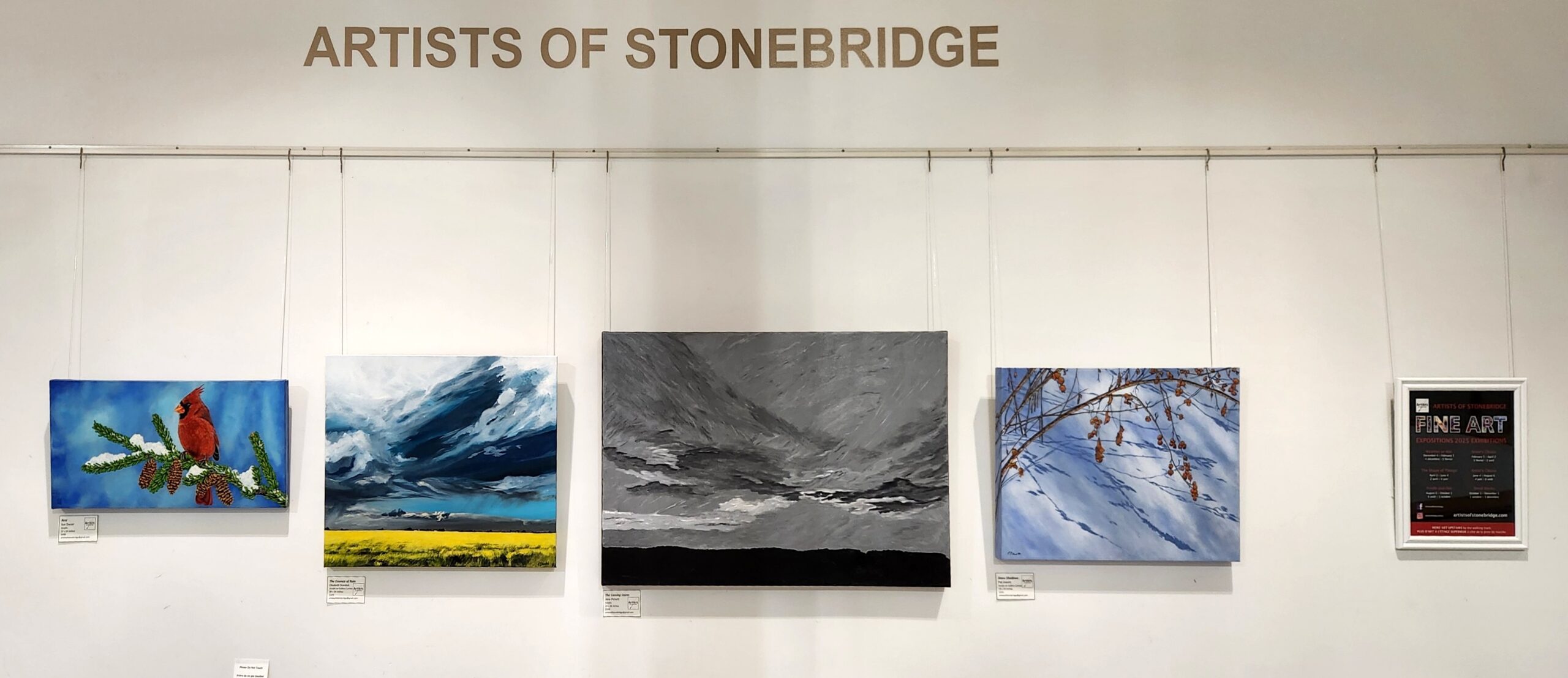 A new exhibit has been hung at the Minto Recreation Complex in Barrhaven on Cambrian Road. It is the first exhibit for the 2025 season and will hang until February 5th. The theme is Weather or Not, and comprises nine paintings from eight of our members.
