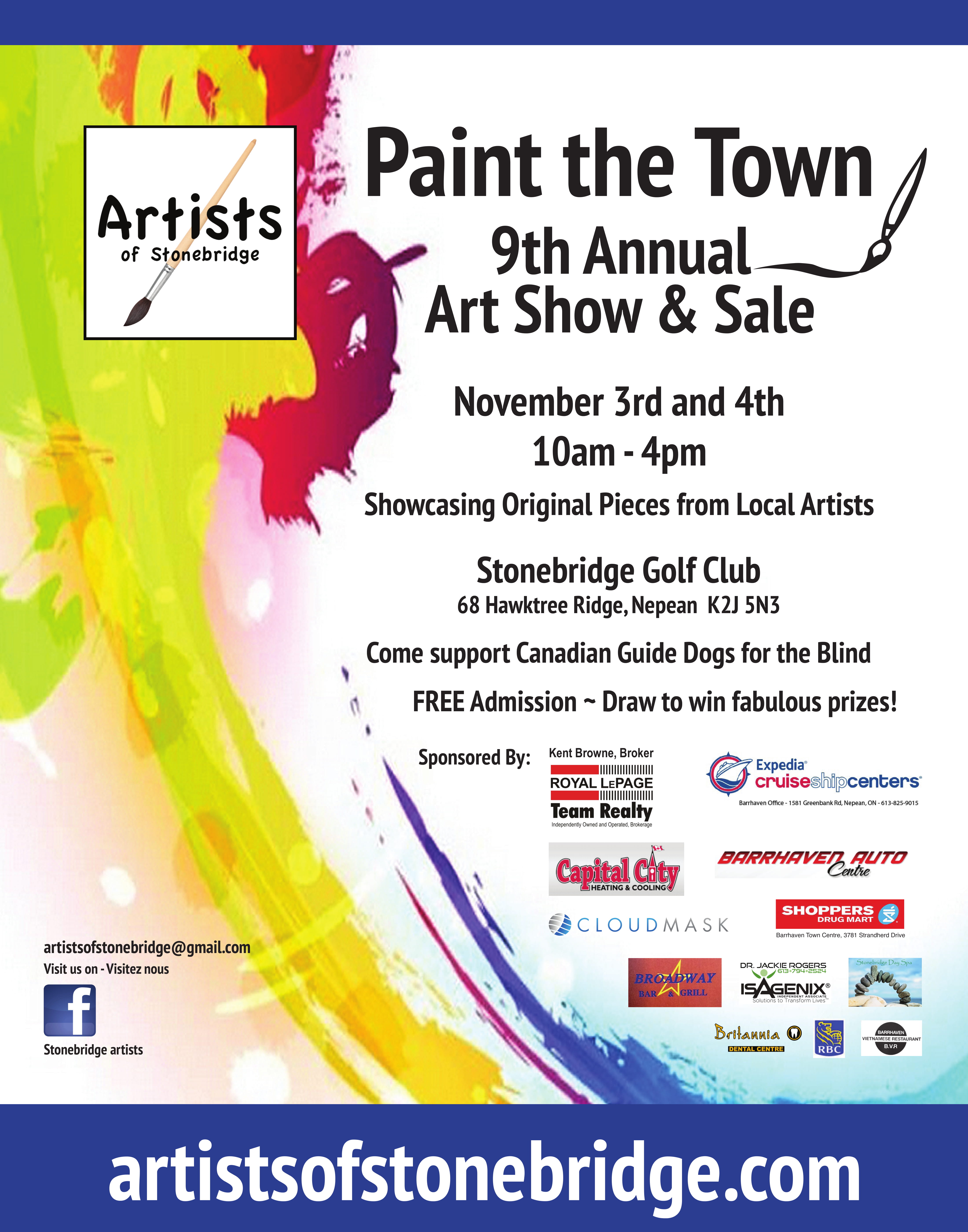 The Artists of Stonebridge will hold “Paint the Town” 9th Annual Art Show and Sale on November 3rd and 4th at the Stonebridge Golf Club at 68 Hawktree Ridge in Barrhaven. Upwards of 25 artists will display their original works from 10am to 4pm, Saturday and Sunday. Admission and parking are free and there will be door prizes. Cash donations will be collected at the door for the Canadian Guide Dogs for the Blind. Get details at artistsofstonebridge.com and Facebook “Stonebridge Artists”.
